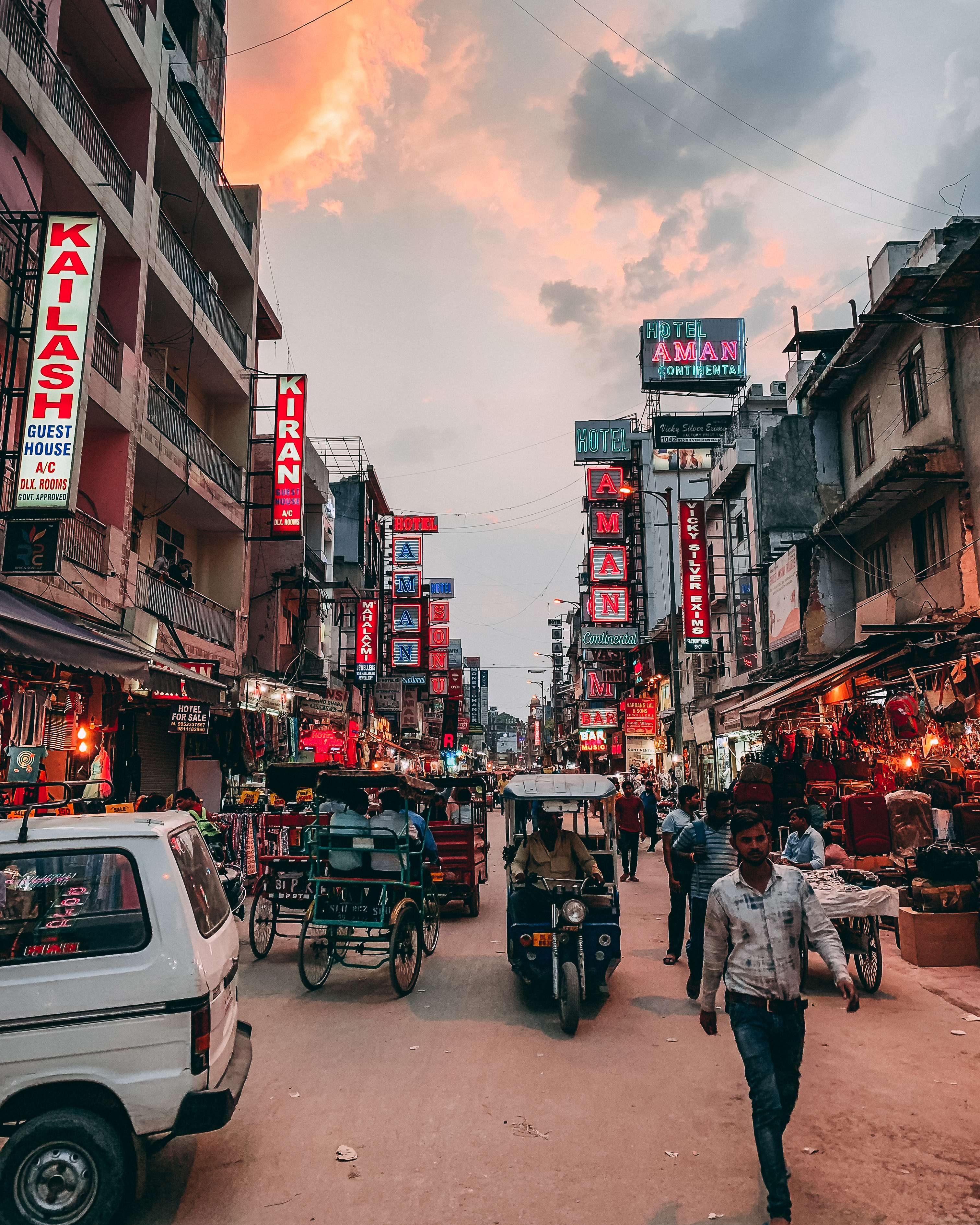 Once we arrived at our hotel (a small, no frills type of establishment), we immediately ventured off to look for a place to eat in the nearby Paharanj neighborhood. Paharanj is an area with tiny alleyways which resemble a brick and mortar garden maze. We ended up at a rooftop restaurant overlooking a busy outdoor bazaar / market. We sat as motorcycles, cars, rickshaws, and people all made their way down the street, which in our opinion looked like a chaotic mess, but in India was pure normality . Non-stop car horns, people’s loud voices, shouting, more car horns, dogs barking, the hustle and bustle of everyone down below…all of which were so new to us and were an instant shock to our system. We were in India!
